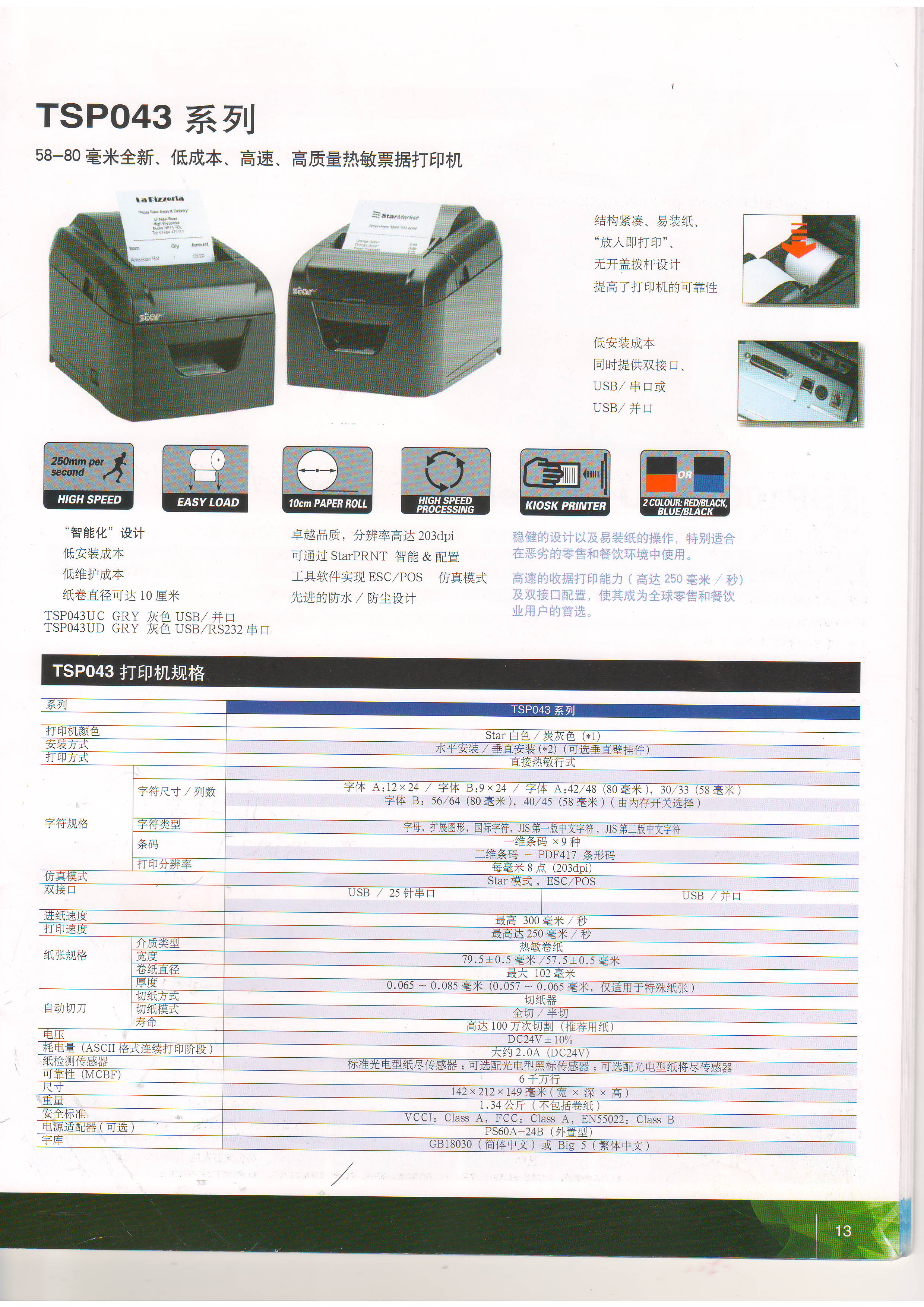 TSP043系列热敏票据打印机,是日本STAR研发的一款58毫米到80毫米全新、低成本、高速、高质量热敏票据打印机。